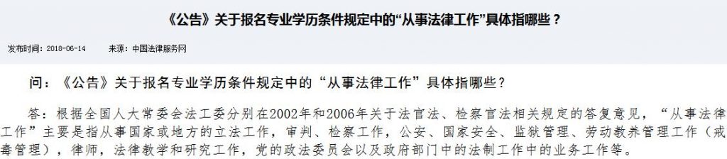 《公告》關於報名專業學歷條件規定中的“從事法律工作”具體指哪些? 發佈於 2020-10-06 由 admin http://www.12348.gov.cn/wcm/pub/12348/sfks/wdk/201806/t20180614_785.html查詢whatsapp: (852) 6222 2202微信: LawyerExam香港中國律師協會www.ChinaLawyer.org.hk粵港澳大灣區國際律師學院www.Law.edu.hk